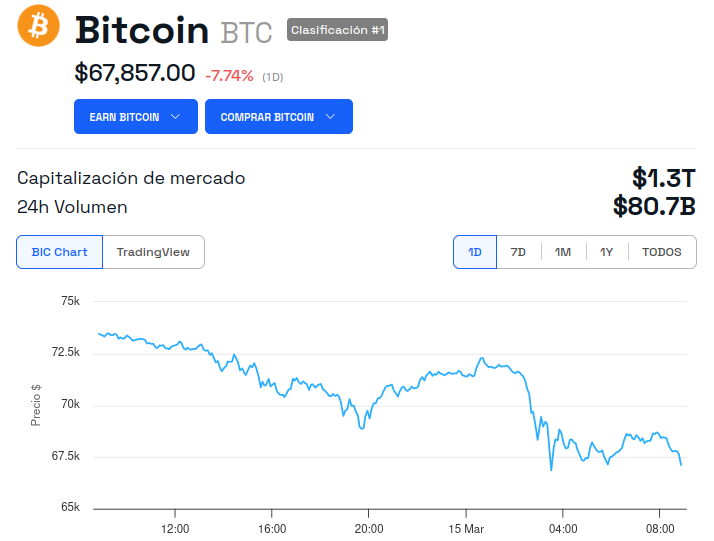 Durante las últimas horas el precio de Bitcoin ha experimentado una caída significativa, desplomándose 8% hasta los 67,000 dólares.