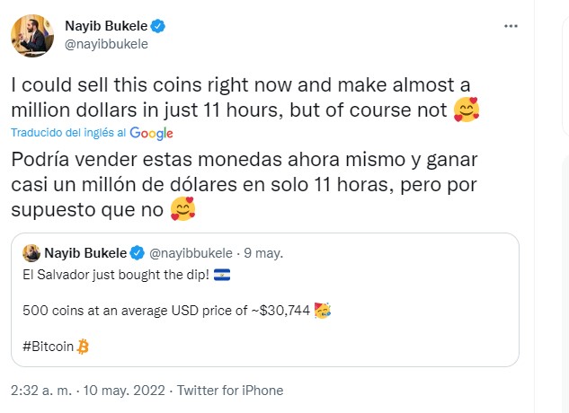 Aún así Bukele sigue firme. Horas después de comprar los 500 BTC y con un rebote en los precios de las criptos, el presidente puso un tweet en donde decía que si vendía los 500 BTC que había comprado tendría una ganancia millonaria, pero no lo haría por su confianza en la tecnología.