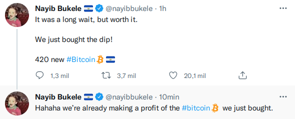 En la tarde del miércoles 27 de octubre, el presidente salvadoreño, Nayib Bukele, confirmó a través de Twitter la compra de 420 BTC adicionales para las reservas del país centroamericano: