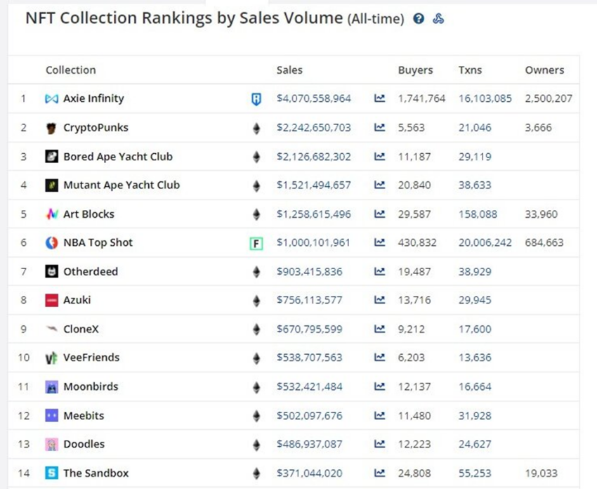 Otros proyectos que compiten por el mayor volumen de ventas incluyen, entre otros, Axie Infinity, Bored Ape Yacht Club (BAYC) y Mutant Ape Yacht Club (MAYC) de Yuga Labs, CryptoPunks, Art Blocks, Otherdeed, Azuki, CloneX, VeerFriends, Moonbirds, Meebits y Doodles.
