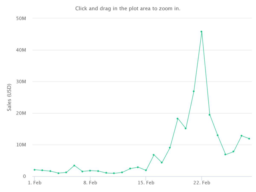 A finales de febrero, NBA Top Shot alcanzó su ATH de volumen de ventas mensual de alrededor de 244 millones de dólares.