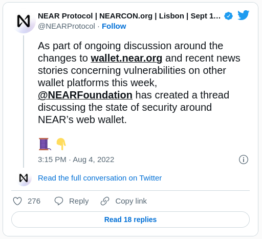 Por lo tanto, pidió a los usuarios que usaron su SMS o correo electrónico para recuperar la cuenta que rotaran sus claves para estar más seguros. Pueden hacerlo en wallet.near.org.