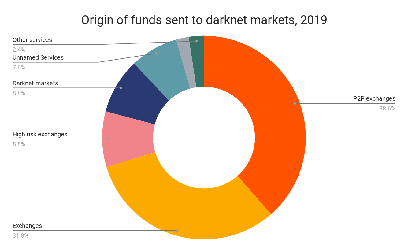 El reporte también resaltó un dato importante que no podemos pasar por alto, según lo que indican, un 38,6% de los fondos que se destinan a operaciones en la Dark Web provienen desde exchanges P2P mientras que un 31,8% son de exchanges centralizados.