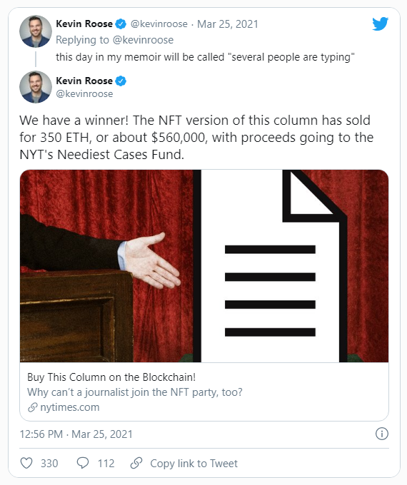 El periodista del New York Times, Kevin Roose, convirtió un artículo que escribió sobre tokens no fungibles en un NFT. El artículo comienza describiendo qué son los NFT. También explica cómo hizo el token y cómo lo puso a subasta. También detalla qué obtiene exactamente alguien cuando compra un NFT.