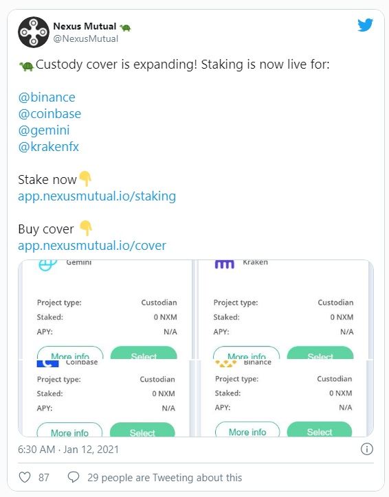 El staking a través de Nexus Mutual ahora está disponible para Binance, Coinbase, Gemini y Kraken. A medida que DeFi continúa creciendo en complejidad, los usuarios necesitarán ofertas de productos innovadores que protejan contra los desastres de cripto.