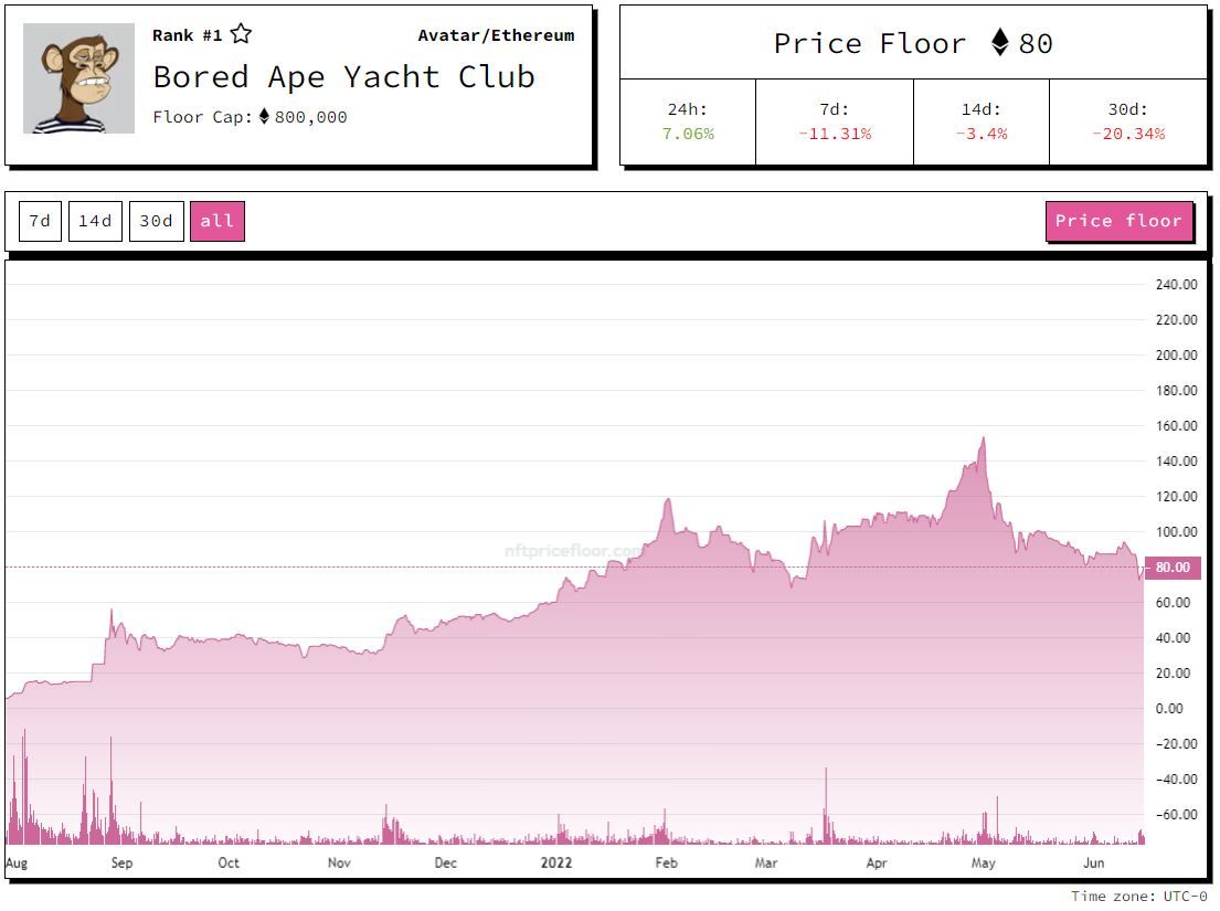 Los icónicos y populares tokens no fungibles (NFT) Bored Ape Yacth Club (BAYC) han bajado 78% desde abril, cuando costaban alrededor de 429,000 dólares, para cotizarse en 80,000 dólares para la segunda semana de junio. Los populares diseños de simios basados en Ethereum (ETH) son una muestra del desplome del mercado cripto.