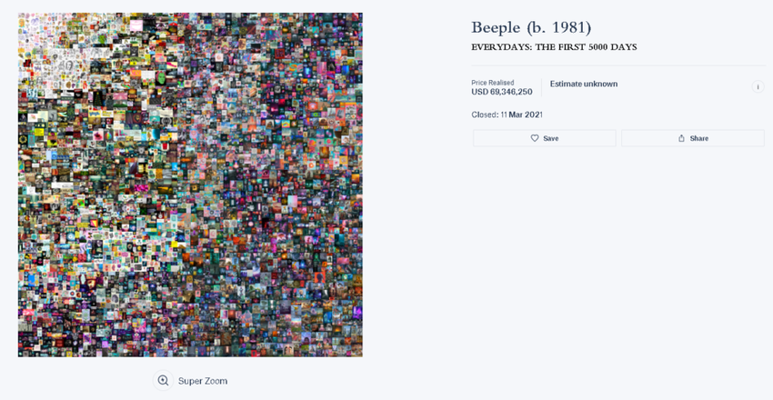 La noticia más importante hasta la fecha ha sido, con mucho, una obra de arte digital de Beeple que se vendió en Christie’s por la asombrosa suma de 69,346,250 dólares. Hasta ahora, ningún NFT se ha vendido a un precio cercano.