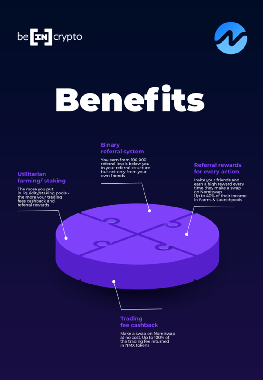 Nomiswap proporciona un exchange descentralizado con las tarifas más bajas y un sistema de referencia binario.