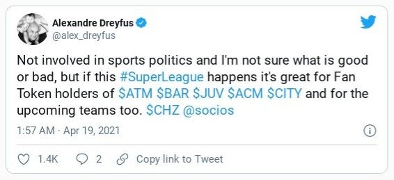 En un tweet publicado en la tarde del lunes 19 de abril, el CEO de Chiliz, Alexandre Dreyfus, comentó que cree que el nuevo campeonato puede mejorar los tokens del ecosistema Chiliz: