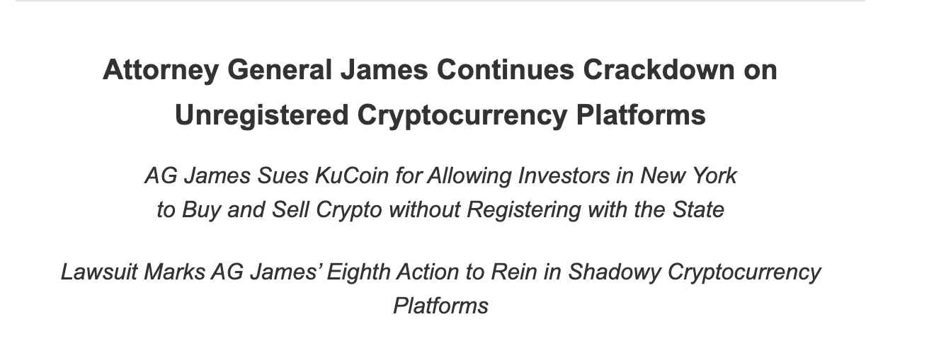La fiscal general de Nueva York, Letitia James, demandó al exchange de criptomonedas KuCoin por no registrarse como corredor de valores y commodities y presentarse “falsamente como exchange”, por lo que “no estaría autorizado de permitir el trading de valores como ether”.