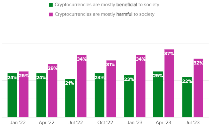 De hecho, las encuestas de Morning Consult han demostrado que más personas en Estados Unidos piensan que las criptomonedas son perjudiciales para la sociedad que personas que piensan que son beneficiosas.
