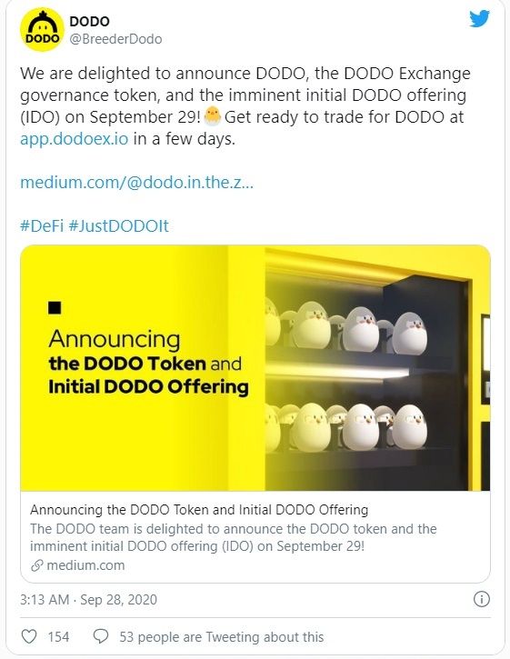 El exchange, que afirma haber ganado 77 millones de dólares en liquidez desde su lanzamiento, anunció la inminente oferta inicial (IDO) de DODO el 29 de septiembre.