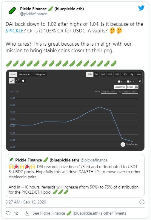 Utilizando el eslogan “‘Off-peg bad, on-peg good” (Fuera de la paridad mala, en la paridad buena; en español), Pickle Finance busca incentivar a los usuarios para que vendan stablecoins que se negocien por encima de su paridad y compren las que estén por debajo.