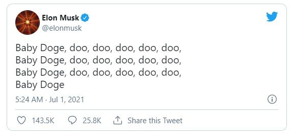 En la madrugada del jueves 1 de Julio, Elon Musk publicó un tweet, en el que escribió repetidamente “Baby Doge, doo, doo, doo, doo, doo”, haciendo referencia a la muy popular canción “Baby Shark“.