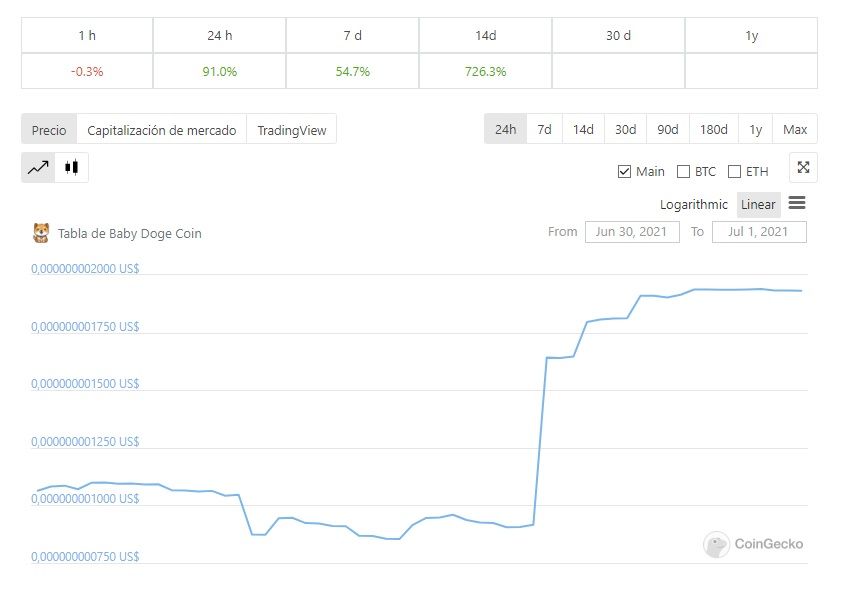 Al momento de la publicación, BABYDOGE se cotiza en 0,000000002026 dólares, con un incremento de más del 90% en las últimas 24 horas y un crecimiento meteórico del 726% en los últimos 14 días.