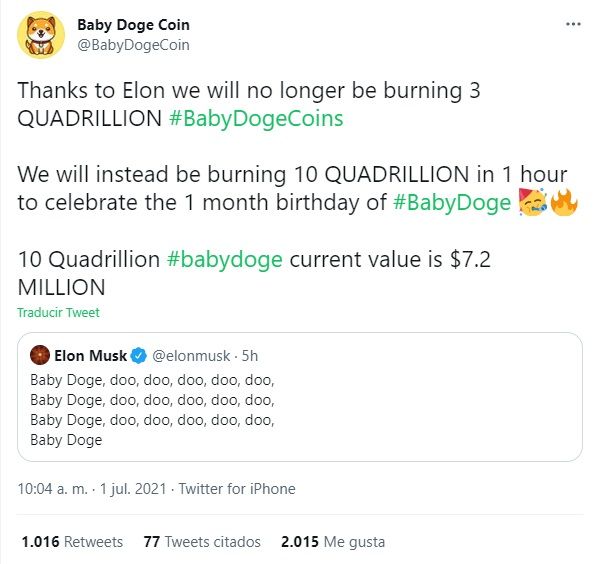 “Gracias a Elon ya no quemaremos 3 CUADRILLONES de #BabyDogeCoins
