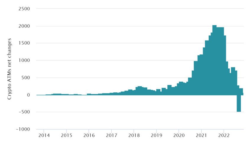 Es de interés el hecho de que las instalaciones globales de cajeros automáticos de Bitcoin se redujeron por primera vez en la historia. Se retiraron cerca de 500 cajeros automáticos.