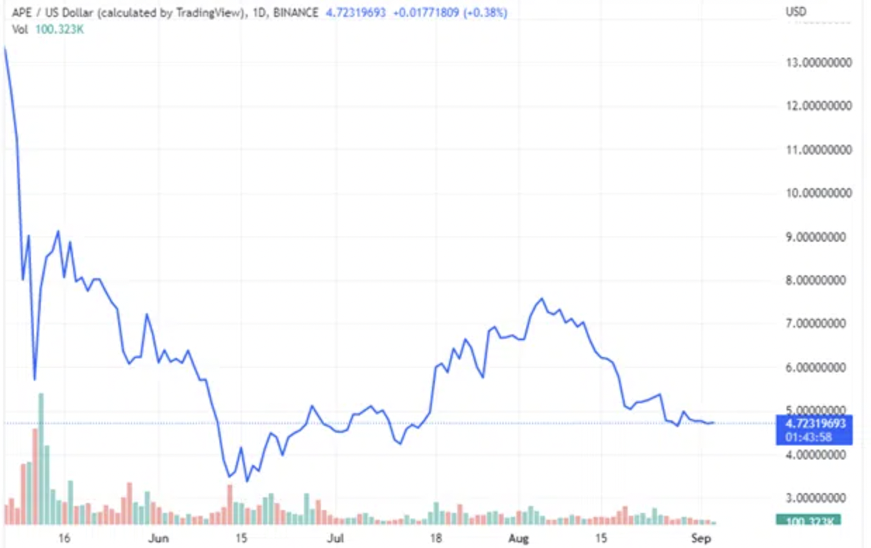 ApeCoin (APE), el activo de cadena de bloques nativo del proyecto Bored Ape, también ha seguido cayendo desde su punto máximo en su mes de apertura en marzo de 2022. APE se negoció en el rango de 4.61- 7.68 dólares durante todo agosto.