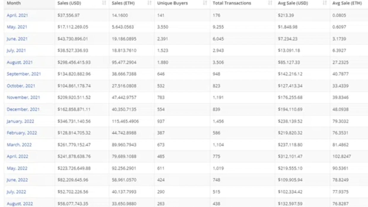 Si bien los compradores únicos se correlacionan con las ventas, la historia de BAYC muestra que ha formado una nueva relación con el valor de venta promedio. Hubo meses en los que los compradores únicos estuvieron por debajo del hito de mayo de 2021, pero el volumen de ventas se mantuvo más alto.
