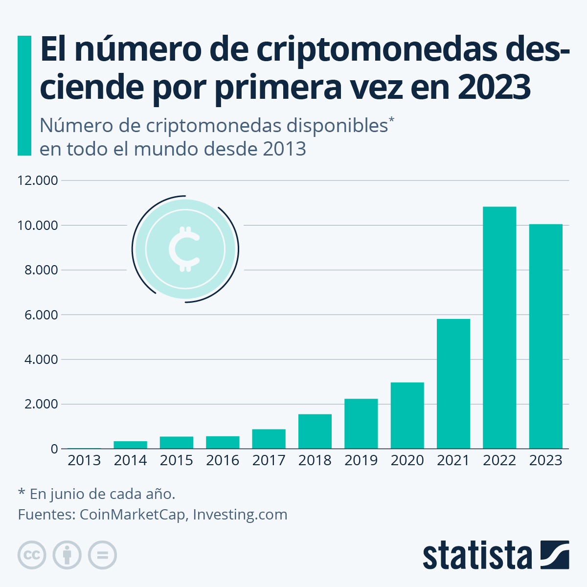 Los últimos datos de Statista mostraron que el número de criptomonedas disponibles en el mercado cayó por primera ocasión. En el primer semestre de 2023, hubo 10,049 criptoactivos distintos y un año antes se habían registrado unos 10,830 activos.