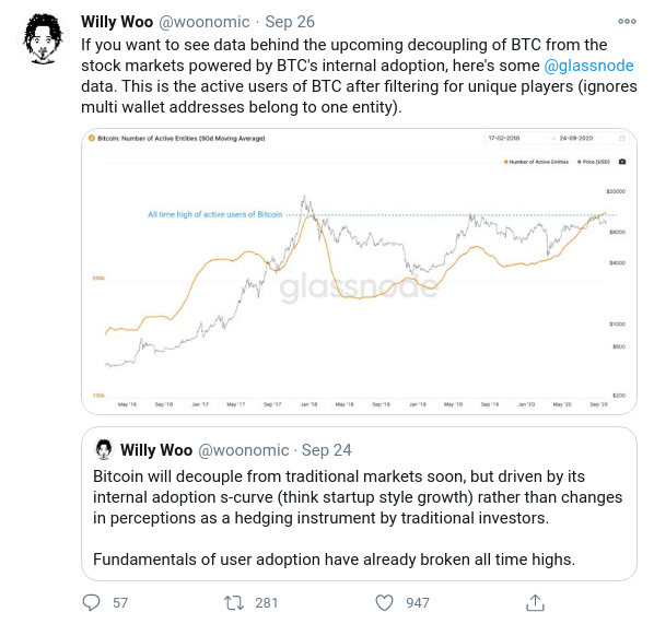 Este punto de vista es compartido por el analista en cadena Willy Woo, quien cree que se está produciendo el llamado desacoplamiento de capital institucional. El 27 de septiembre, BeInCrypto informó que la posición de Woo es que la adopción interna está impulsando el aumento de Bitcoin y que los fundamentos de la adopción se convertirán en el factor más importante que determinará el futuro de Bitcoin.