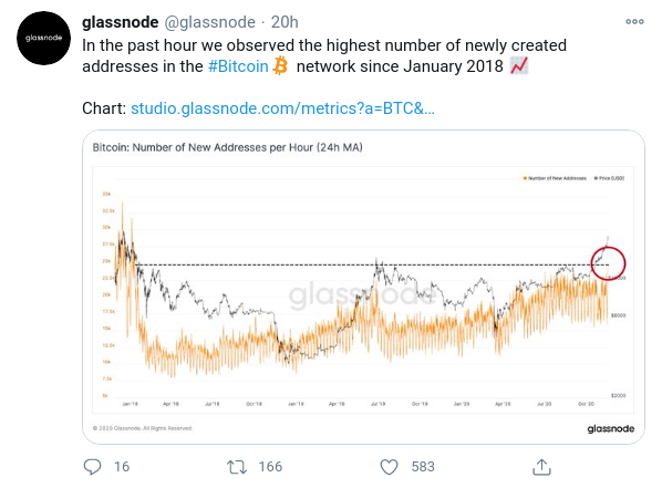La cantidad de direcciones de red de Bitcoin creadas durante los últimos 24 días ha alcanzado su nivel más alto desde enero de 2018. La información anterior es según los datos publicados por la empresa de inteligencia de mercado en cadena GlassNode. En Twitter, GlassNode declaró que la cantidad de nuevas direcciones creadas el 18 de noviembre llevó al máximo actual.
