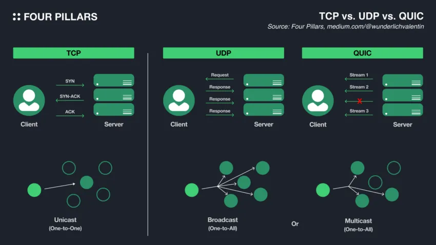 “QUIC es un nuevo protocolo de comunicación basado en UDP, que mantiene sus ventajas al tiempo que simplifica los flujos de conexión y los procesos de protocolo de enlace de TCP. Por lo tanto, QUIC permite a Solana lograr una comunicación confiable, solicitar la retransmisión solo para flujos con pérdida de paquetes y continuar transmitiendo el resto sin interrupción, mejorando significativamente la eficiencia de la red”, agregaron los investigadores de Four Pillars.