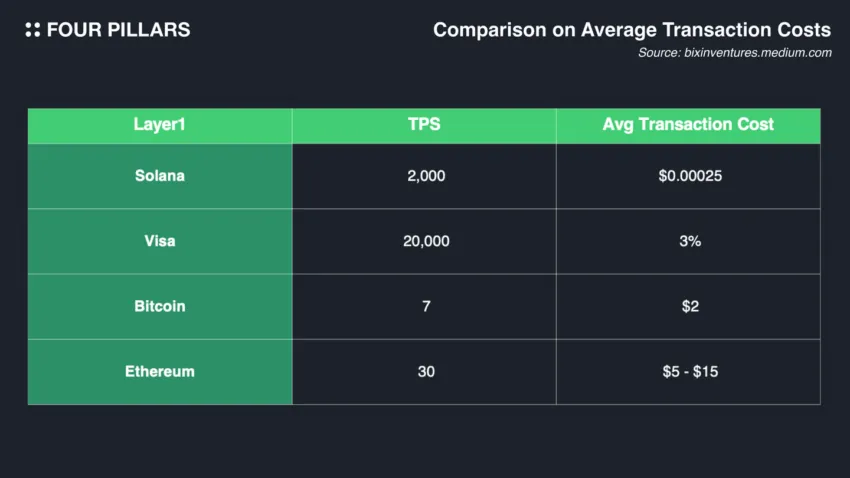 “Solana es capaz de procesar miles de transacciones por segundo, con tiempos de bloque registrados a 400-500 ms, un rendimiento significativamente mayor que las blockchains existentes. En última instancia, la adopción de este enfoque técnico por parte de Solana tiene como objetivo lograr dos misiones: una plataforma expandible que pueda manejar un alto uso y componibilidad entre aplicaciones”, escribieron los investigadores de Four Pillars.