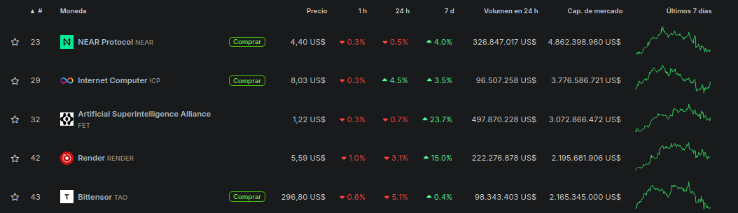 Dentro del top 5 criptomonedas de IA, el único token que ha registrado números positivos de Internet Computer (ICP). El precio de ICP acumula un aumento del 4.5% en las últimas 24 horas. Este movimiento positivo de precios se debe a su reciente integración de un modelo de inteligencia artificial “totalmente on-chain”.
