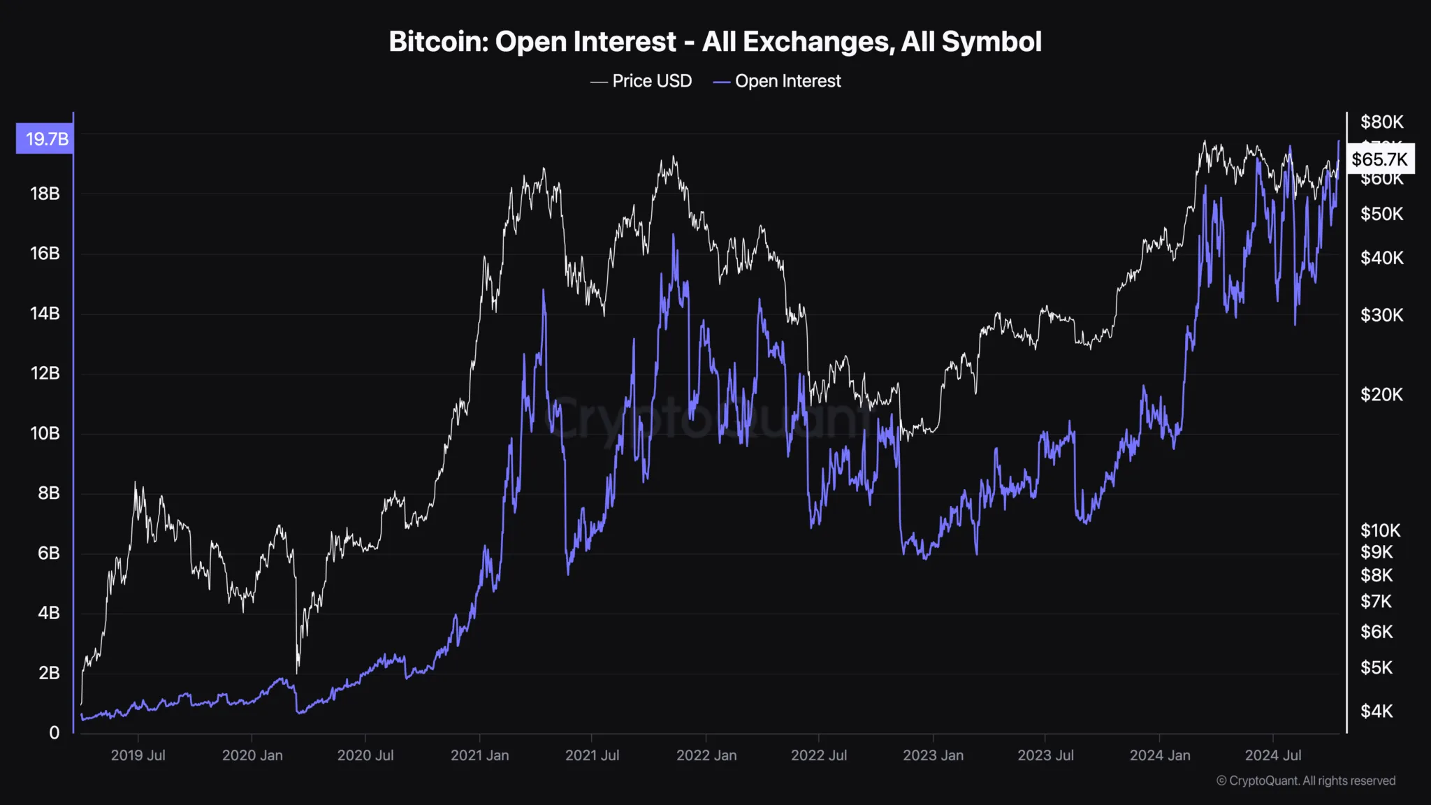 Según CryptoQuant, el Interés Abierto de Bitcoin ha alcanzado un nuevo máximo histórico de 19,80 mil millones de dólares. La última vez que la métrica fue tan alta fue en julio. Durante ese período, el precio de la moneda casi retestó los 68,000 dólares.