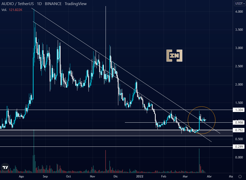 El precio de AUDIO rechaza el área de resistencia de los 1.3 dólares y se lateraliza en el área de soporte de 1 dólar.