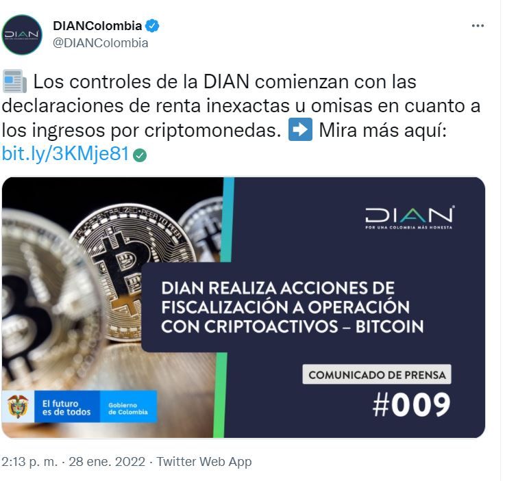 La Dirección de Impuestos y Aduanas Nacionales (DIAN) de Colombia anunció que iniciará acciones para garantizar un control fiscal sobre operaciones con Bitcoin (BTC) y otras criptomonedas. Argumentó que las gestiones son para ayudar en la lucha contra la evasión fiscal, lavado de criptoactivos y financiamiento a actividades ilícitas o terrorismo.