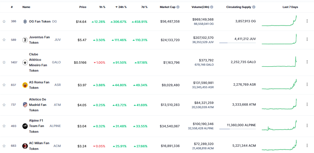 OG Fan Token no es la única altcoin que ha experimentado ganancias significativas en las últimas 24 horas. Diversos fan tokens han aumentado vertiginosamente en ese período de tiempo.