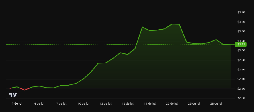 Una ruptura por encima de 3.41 dólares abriría la puerta a un movimiento alcista, acercando el precio a su máximo histórico de 3.66 dólares. Este posible repunte dependerá en gran medida del desempeño del mercado global y del comportamiento de los grandes tenedores en los próximos días.