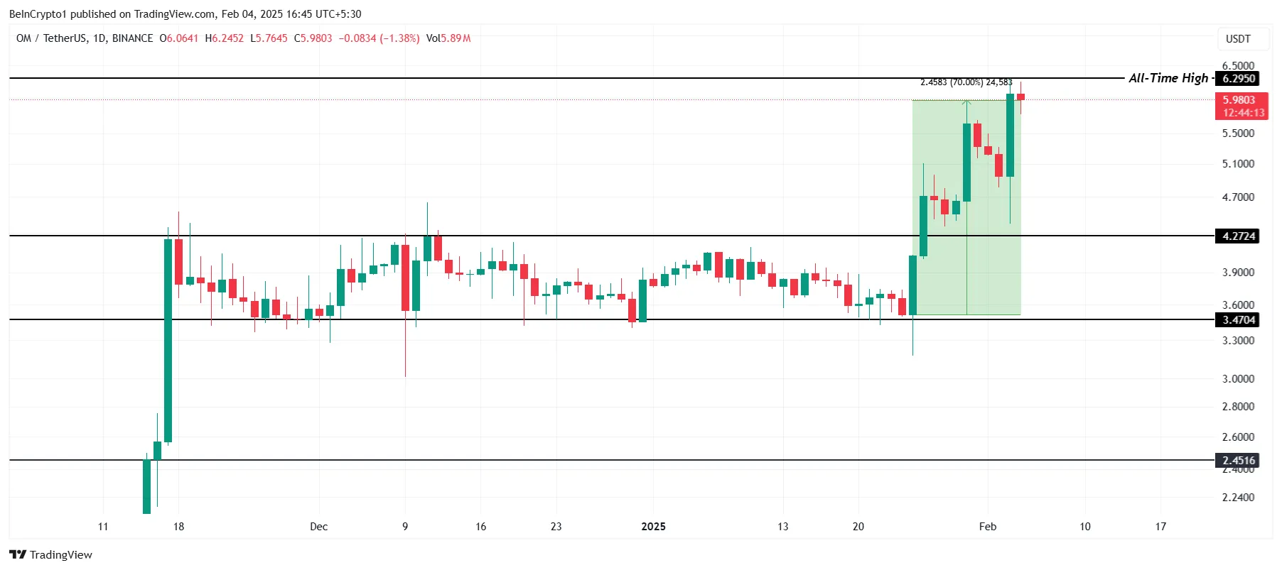 OM ha experimentado un impresionante aumento del 70% en los últimos 10 días, rompiendo una fase de consolidación de dos meses. La altcoin recientemente alcanzó un nuevo máximo histórico (ATH) de 6,29 dólares, reflejando un fuerte impulso alcista.