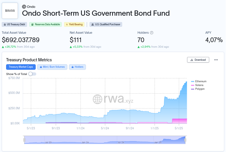 Su producto OUSG, en particular, ha alcanzado un TVL de 670 millones de dólares, destacándose como uno de los principales fondos tokenizados de bonos del Tesoro.