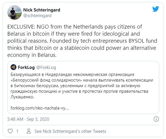Una organización sin fines de lucro con sede en los Países Bajos, acertadamente llamada Fondo de Solidaridad Bielorruso, comenzó a pagar una compensación en Bitcoin a los manifestantes en Bielorrusia.