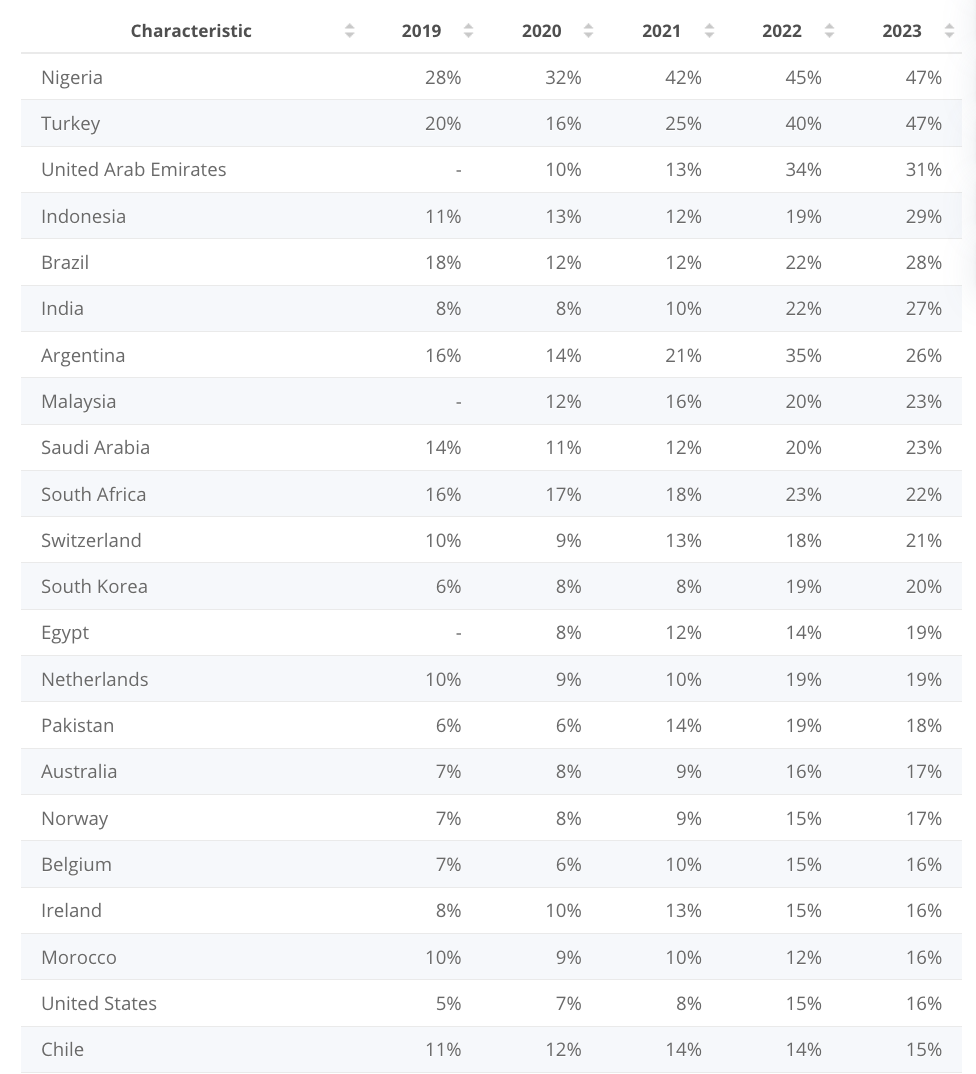 SponsoredEl último ranking de Statista de los 56 países que más han utilizado criptomonedas de 2919 a 2023, expone que la adopción de Bitcoin crece en América Latina 10% anual. Los países de la región con más usuarios cripto son: Brasil, Argentina y Chile.