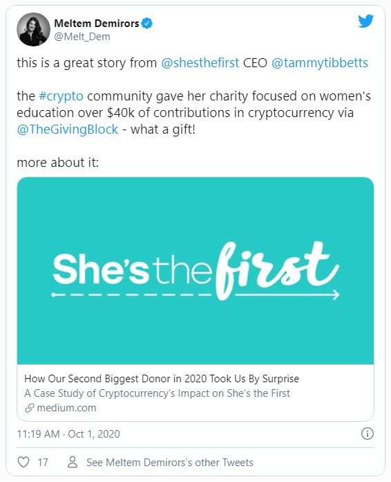 El escepticismo hacia las cripto por parte de la CEO cambió cuando Henah Parikh, Gerente de Desarrollo y Comunicaciones de She’s The First, finalmente la convenció para que aceptara donaciones con criptomonedas. La organización benéfica comenzó a trabajar con The Giving Block, que le invitó a convertirse en beneficiaria de sus campañas de primavera de 2020.
