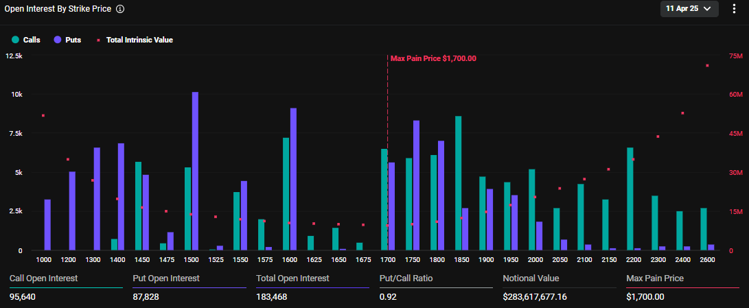 Además de las opciones de Bitcoin, 183,468 contratos de Ethereum están programados para vencer hoy. Estas opciones que vencen tienen un valor nominal de 283,6 millones de dólares y una relación Put/Call de 0.92. El punto de máximo dolor es de 1,700 dólares.