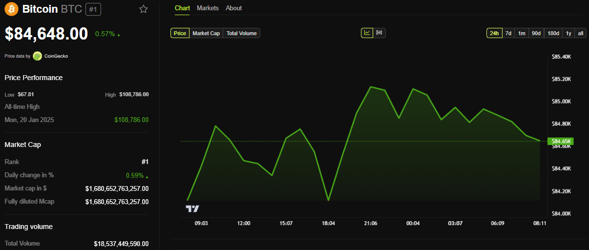 Al momento de escribir esto, Bitcoin se negociaba por 84,648 dólares, ligeramente por encima de su precio de ejercicio de 82,000 dólares. Basado en la teoría del Dolor Máximo, es probable que los precios se muevan hacia este precio de ejercicio a medida que las opciones se acercan a su expiración.