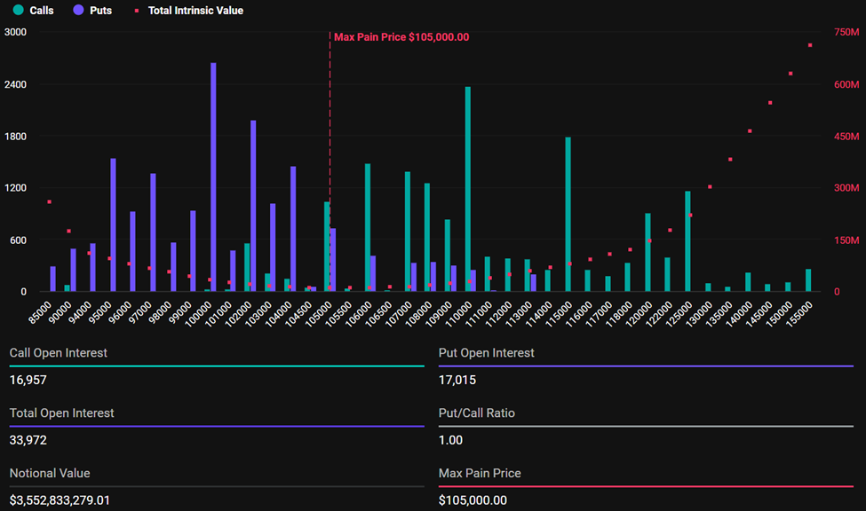 Para Bitcoin, las opciones que vencen tienen un precio de dolor máximo de 105,000 dólares y una relación Put/Call de 1.00. Esto indica que los traders podrían estar igualmente divididos entre perspectivas bajistas (comprando puts) y alcistas (comprando calls).