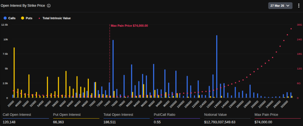 El nivel de “max pain” se sitúa en torno a 74,000 dólares, aproximadamente un 8% por encima del precio actual. Este punto suele actuar como referencia para movimientos del mercado durante el vencimiento.