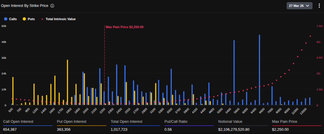 Ethereum presenta un patrón similar. Con un valor nocional de 2,1 mil millones de dólares, su “max pain” se ubica en torno a 2,250 dólares, también por encima del precio actual.