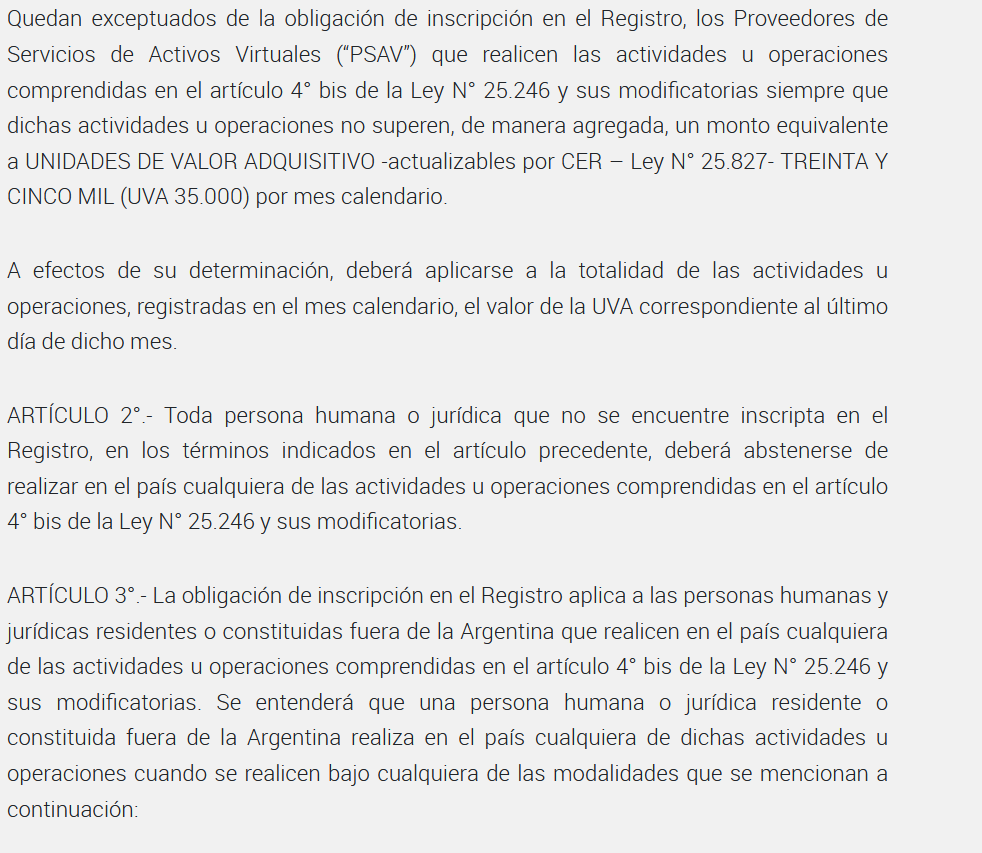 Se establece una excepción para aquellos individuos o entidades cuyas actividades en el mercado de criptomonedas no superen un monto equivalente a 35.000 Unidades de Valor Adquisitivo (UVAs) en el mes calendario. Valor equivalente a casi $27 millones al tipo de cambio actual. Esto busca aliviar la carga regulatoria sobre pequeños operadores o entidades con actividades limitadas en este sector.