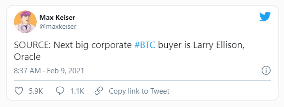 Max Keizer es un inversor en criptomonedas y fundador de Heisenberg Capital, Keizer hizo la afirmación a través de un tweet, atribuyendo el comentario a una “fuente”. Ellison, cofundador de la empresa global de tecnología informática Oracle, es partidario de la tecnología blockchain, afirmando anteriormente que tiene usos en todos los campos.
