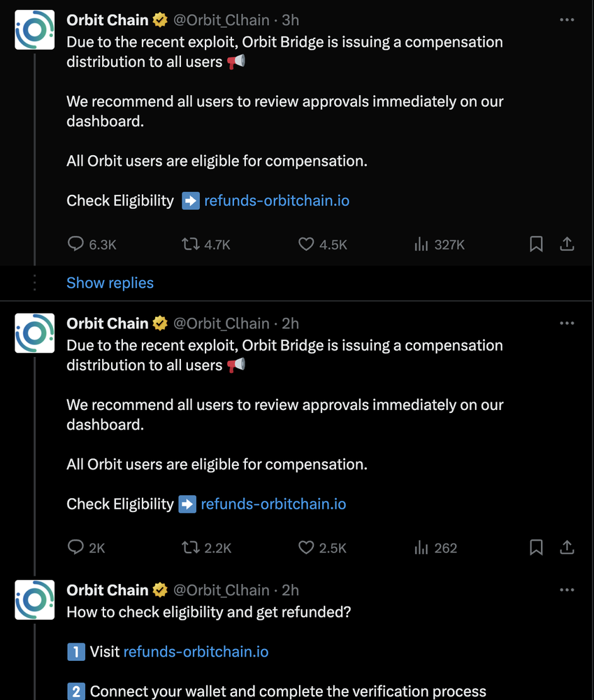 La siguiente captura de pantalla muestra que muchos estafadores se están haciendo pasar por Orbit Chain en X, pidiendo a los usuarios que hagan clic en un enlace para reclamar el reembolso de la cantidad perdida por el hack.