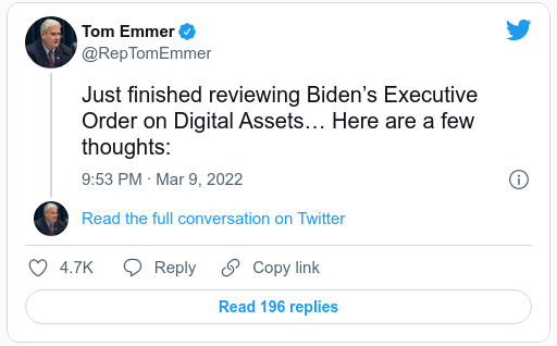 El senador republicano pro-cripto, Tom Emmer, también ha expresado sus pensamientos sobre la orden, afirmando que es imperativo que EE. UU. como nación desarrolle una estrategia para fomentar esta innovación.