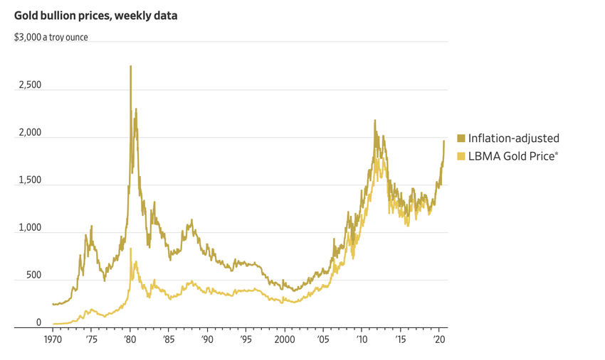 SponsoredLos impulsos alcistas anteriores con oro siempre han coincidido con el caos económico. El primer impulso masivo, que llevó al oro a su máximo histórico ajustado a la inflación, ocurrió a finales de los 70 durante la crisis del petróleo.