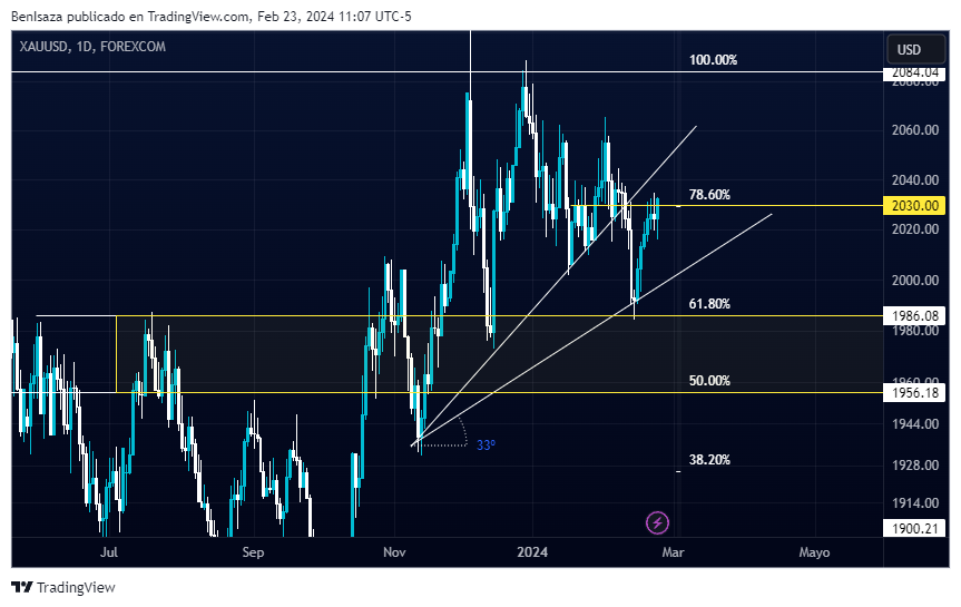 Sin embargo, de no lograr consolidar la ruptura de esta importante área de precios, supone una continuidad bajista con objetivo los 1,986 dólares que corresponden al 61.8 de Fibonacci.